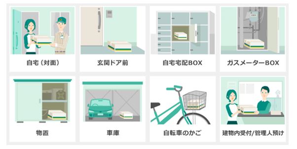 通常の対面受け取り以外に、玄関ドア前、自宅宅配BOX、ガスメーターBOX、物置、車庫、自転車のかご、建物内受付/管理人預けなど、お客さまの多様な指定場所での受け取りに対応します。