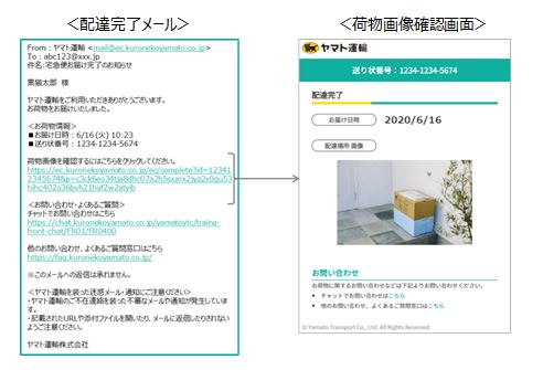 配達完了後、リアルタイムに配達完了メールがお客さまに通知されます。また、非対面での配達をご指定いただいた場合は、メールに記載されるURLから配達員が荷物を置いた場所を撮影した写真を確認できるため安心して受け取りいただけます。